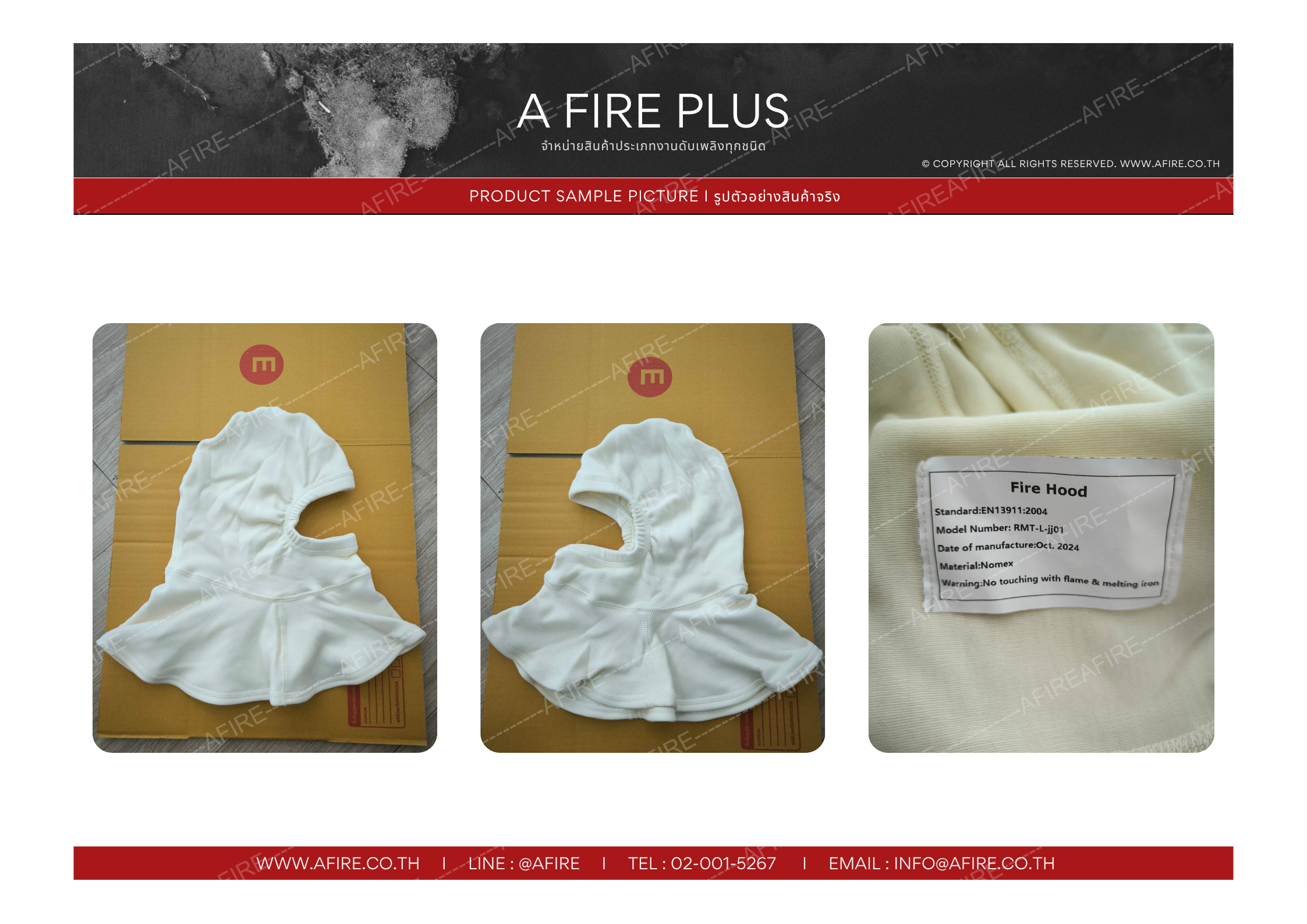 เป็นผ้าคลุมศีรษะ ชนิด 2 ชั้น ชั้นนอกทําด้วยวัสดุทนความร้อน และไม่ติดไฟ ชนิด NOMEX ชั้นในทําด้วยผ้านุ่มและซับเหงื่อ ส่วนขอบใบหน้าทําด้วยผ้ายางยืด ขนาด 1/2 นิ้ว แข็งแรงทนทาน และยึดได้มากกว่า25% กระชับได้ดีกับใบหน้า และหน้ากากเครื่องช่วยหายใจ แนวตะเข็บเย็บแบบแนวคู่ โดยใช้ด้าย NOMEX 100% ผลิตตามมาตรฐาน NFPA 1971-2007 จาก USA