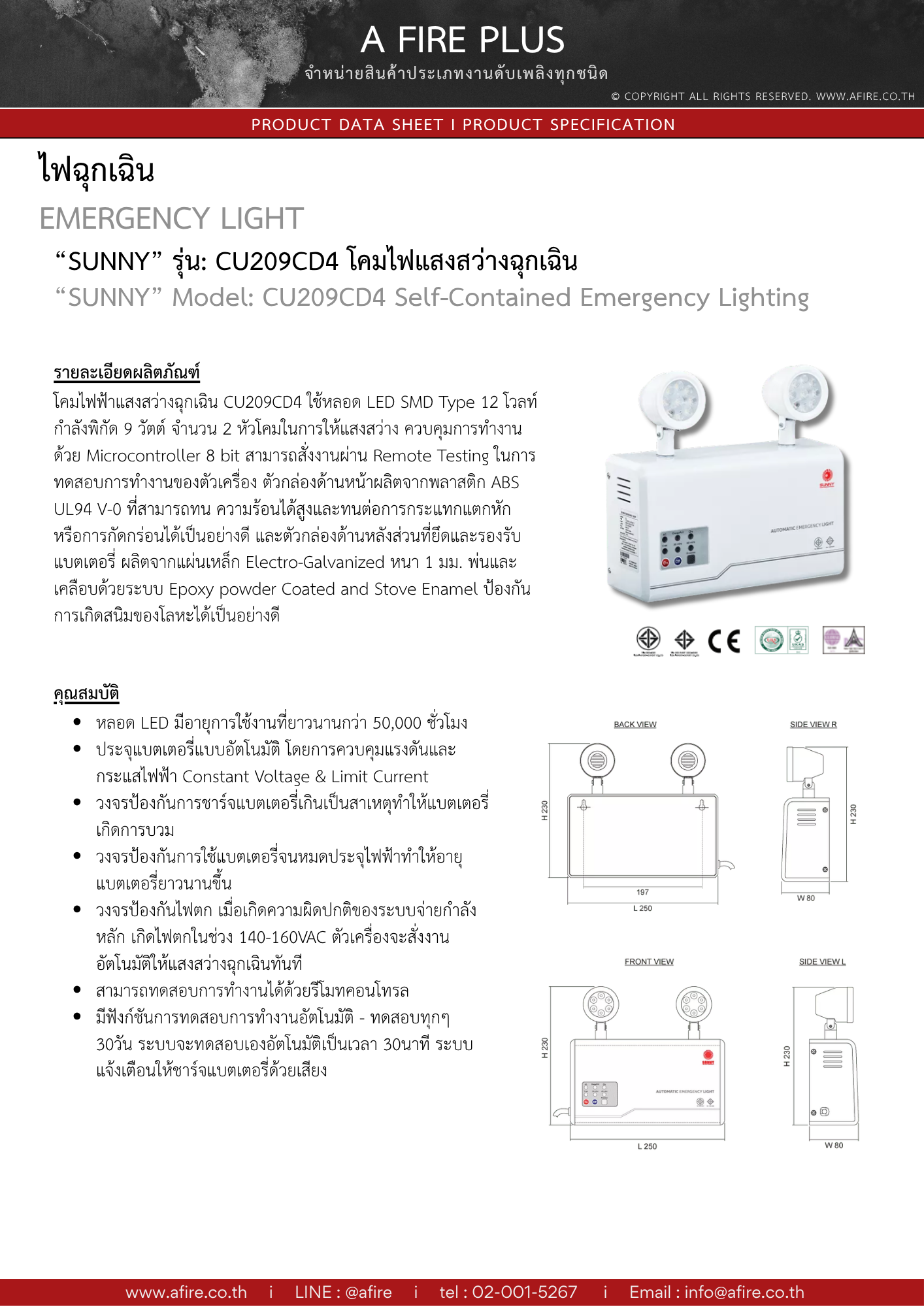 โคมไฟฟ้าแสงสว่างฉุกเฉิน CU209CD4 ใช้หลอด LED SMD Type 12 โวลท์ กําลังพิกัด 9 วัตต์ จํานวน 2 หัวโคมในการให้แสงสว่าง ควบคุมการทํางานด้วย Microcontroller 8 bit สามารถสั่งงานผ่าน Remote Testing ในการทดสอบการทํางานของตัวเครื่อง ตัวกล่องด้านหน้าผลิตจากพลาสติก ABS UL94 V-0 ที่สามารถทน ความร้อนได้สูงและทนต่อการกระแทกแตกหักหรือการกัดกร่อนได้เป็นอย่างดี และตัวกล่องด้านหลังส่วนที่ยึดและรองรับแบตเตอรี่ ผลิตจากแผ่นเหล็ก Electro-Galvanized หนา 1 มม. พ่นและเคลือบด้วยระบบ Epoxy powder Coated and Stove Enamel ป้องกันการเกิดสนิมของโลหะได้เป็นอย่างดี หลอด LED มีอายุการใช้งานที่ยาวนานกว่า 50,000 ชั่วโมง ประจุแบตเตอรี่แบบอัตโนมัติ โดยการควบคุมแรงดันและกระแสไฟฟ้า Constant Voltage & Limit Current วงจรป้องกันการชาร์จแบตเตอรี่เกินเป็นสาเหตุทําให้แบตเตอรี่เกิดการบวม วงจรป้องกันการใช้แบตเตอรี่จนหมดประจุไฟฟ้า ทําให้อายุแบตเตอรี่ยาว นานขึ้น วงจรป้องกันไฟตก เมื่อเกิดความผิดปกติของระบบจ่าย กําลังหลัก เกิดไฟตกในช่วง 140-160VAC ตัวเครื่องจะสั่งงานอัตโนมัติให้ แสงสว่างฉุกเฉินทันที สามารถทดสอบการทํางานได้ด้วยรีโมทคอนโทรล (Remote Testing) มีฟังก์ชันการทดสอบการทํางานอัตโนมัติ (Automatic Testing System) ทดสอบทุกๆ 30 วัน ระบบจะทดสอบเองอัตโนมัติเป็น เวลา 30 นาที ระบบแจ้งเตือนให้ชาร์จแบตเตอรี่ด้วยเสียง (Battery Checker)