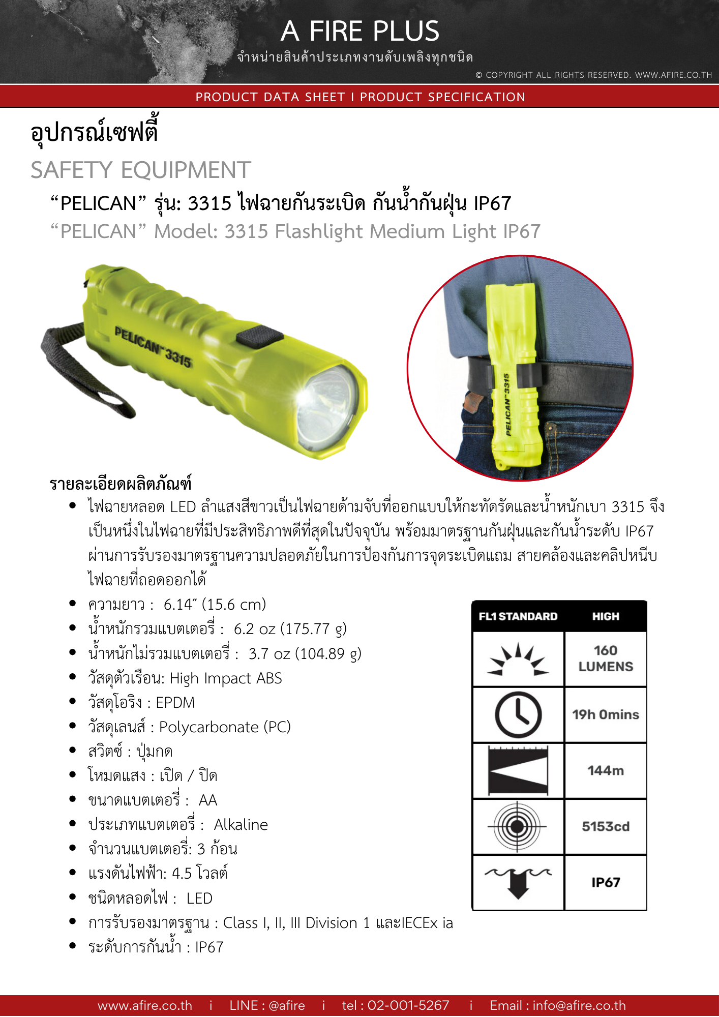 ไฟฉายหลอด LED ลำแสงสีขาวเป็นไฟฉายด้ามจับที่ออกแบบให้กะทัดรัดและน้ำหนักเบา 3315 จึงเป็นหนึ่งในไฟฉายที่มีประสิทธิภาพดีที่สุดในปัจจุบัน พร้อมมาตรฐานกันฝุ่นและกันน้ำระดับ IP67 ผ่านการรับรองมาตรฐานความปลอดภัยในการป้องกันการจุดระเบิดแถม สายคล้องและคลิปหนีบไฟฉายที่ถอดออกได้