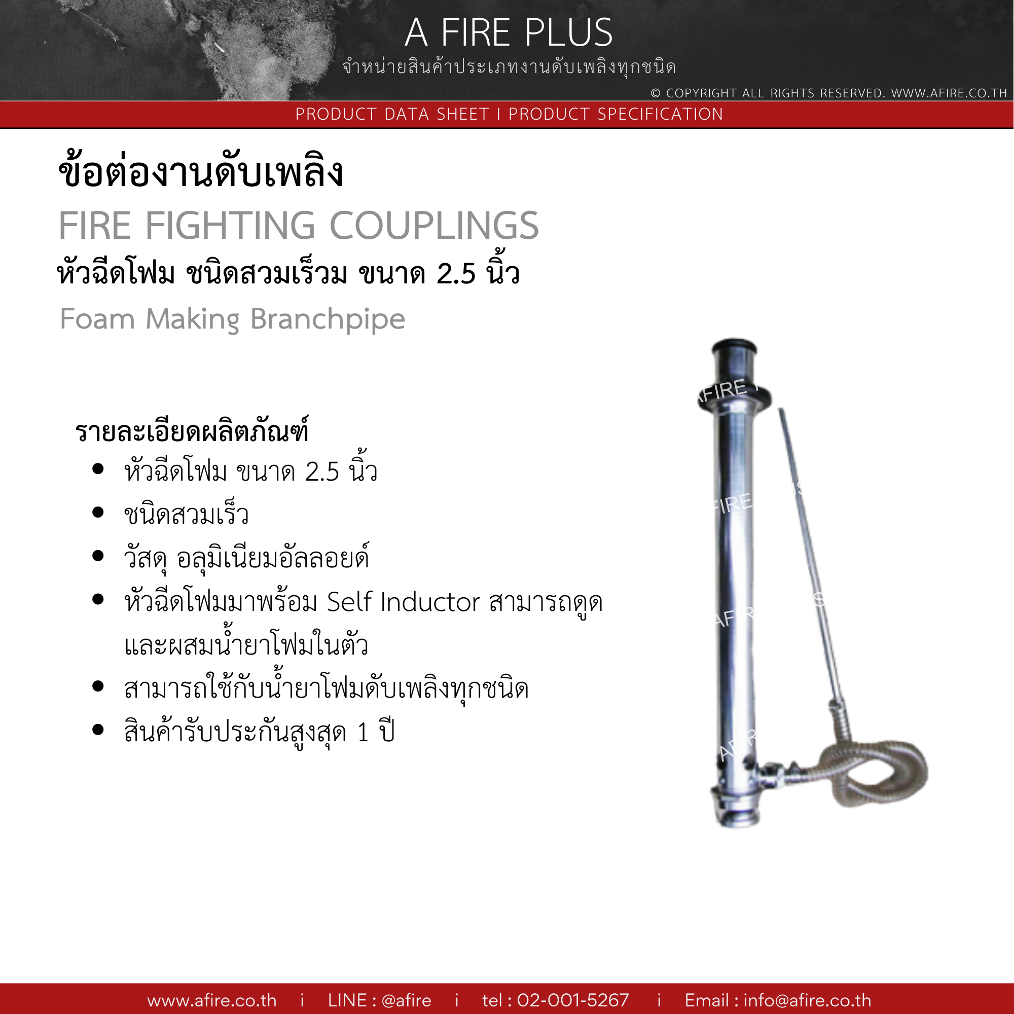 หัวฉีดโฟม ขนาด 2.5 นิ้ว ชนิดสวมเร็ว หัวฉีดโฟมทําจากอลูมิเนียม (อัลลอย) หัวฉีดโฟมมาพร้อม Self Inductor สามารถดูดและผสมน้ํายาโฟมในตัว สามารถใช้กับน้ํายาโฟมดับเพลิงทุกชนิด สินค้ารับประกันสูงสุด 1 ปี