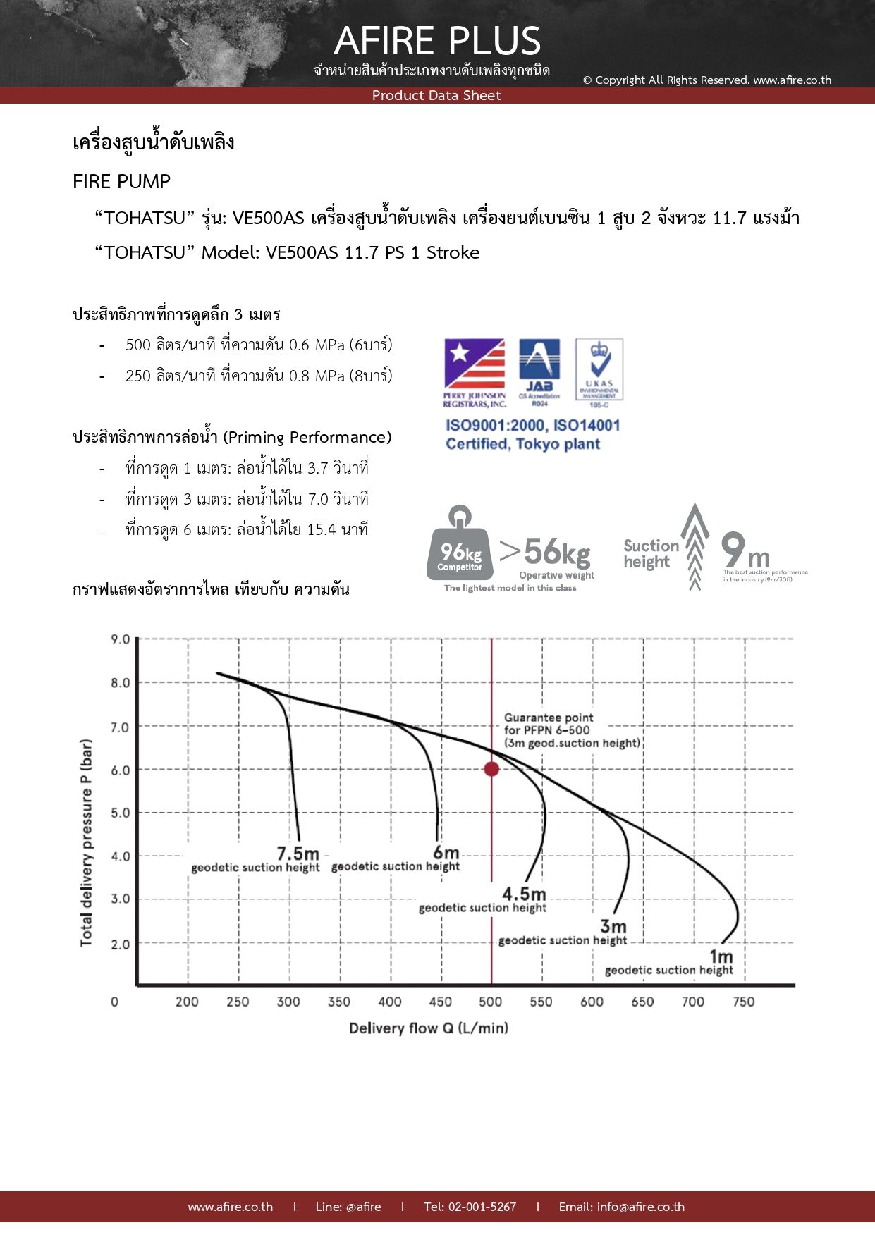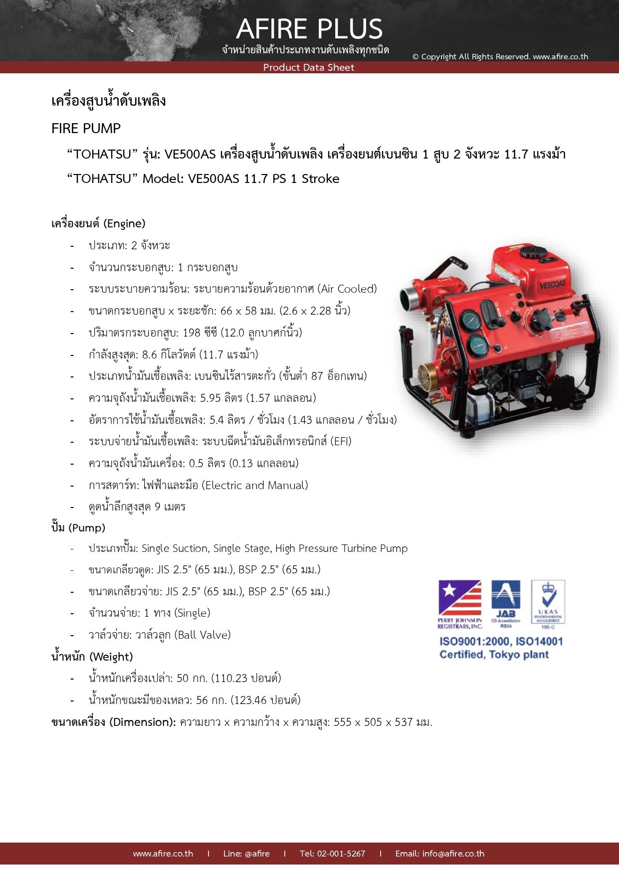 "TOHATSU" เครื่องสูบน้ำดับเพลิง (ปั๊มดับเพลิง) รุ่น VE500AS (ต่อ)