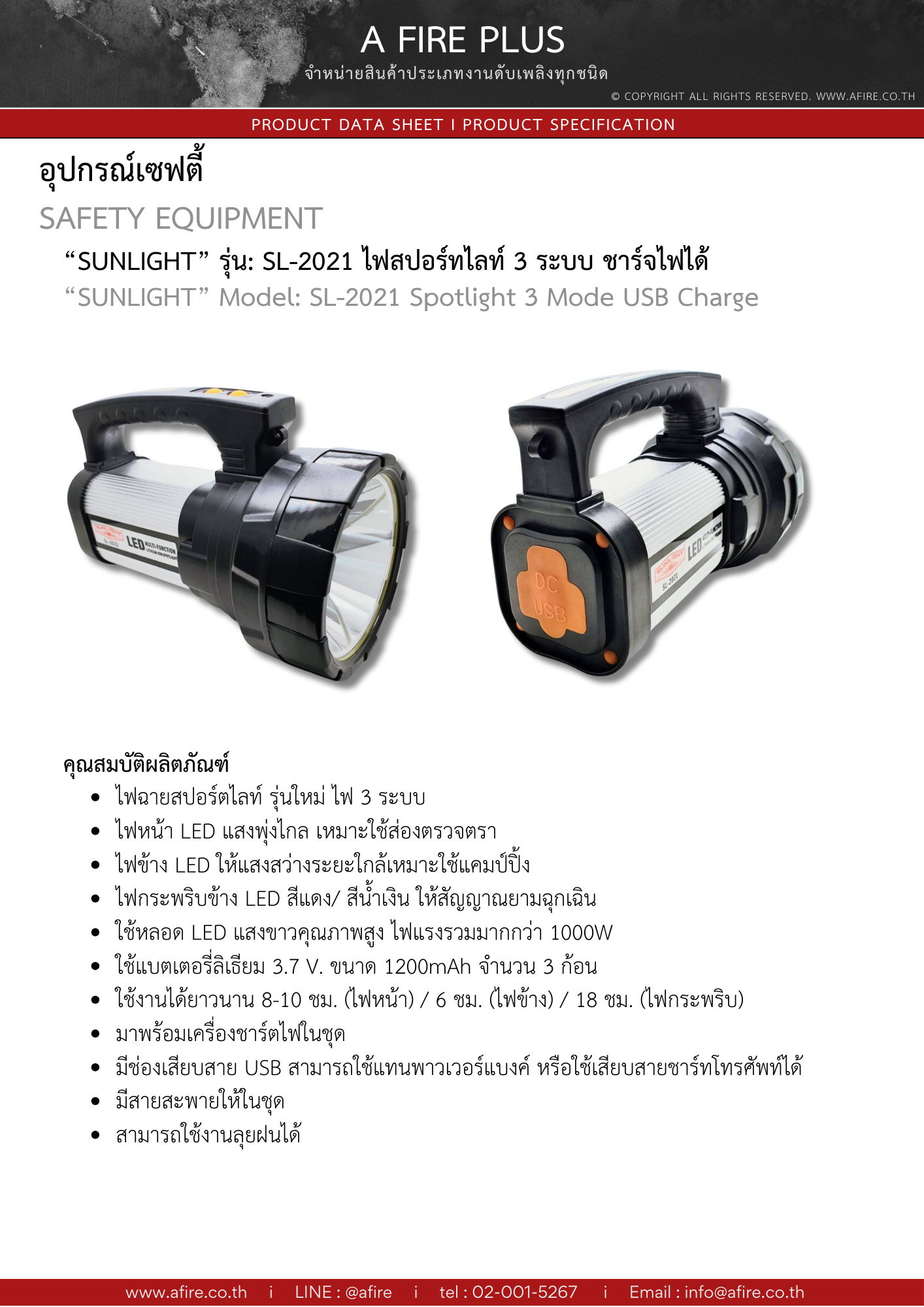 "sunlight" รุ่น : SL-2021 ไฟสปอร์ทไลน์ 3 ระบบ ชาร์จไฟได้ ใช้งานได้ยาวนาน 8-10 ชั่วโมง