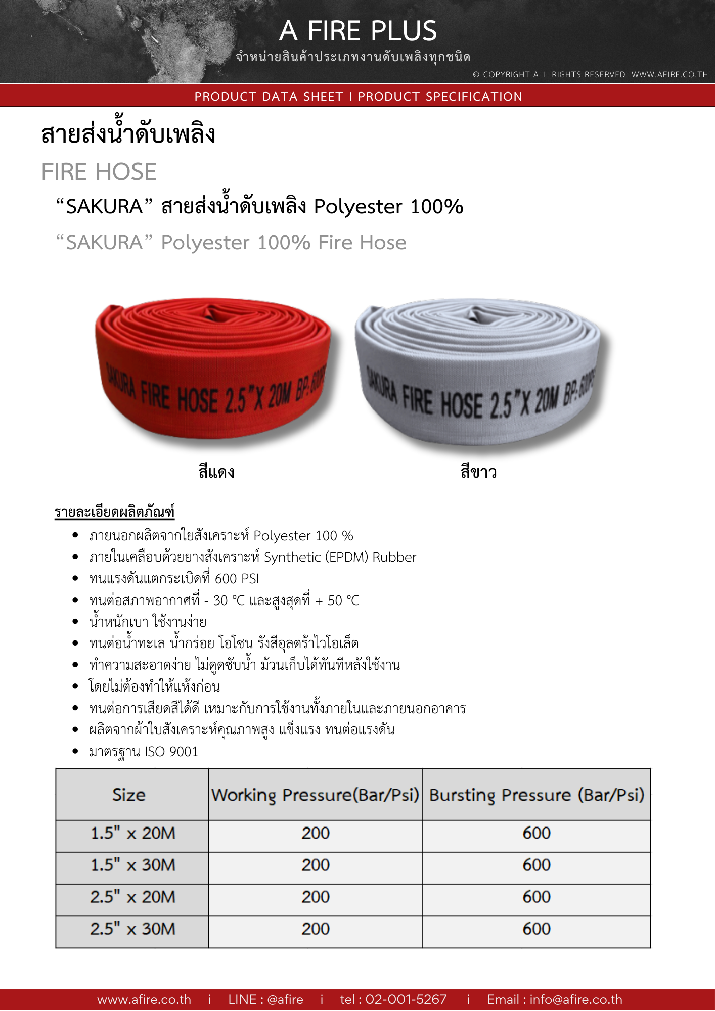 สายส่งน้ำดับเพลิงผลิตจากใยสังเคราะห์ (RED) Polyester 100 % สีแดง ยี่ห้อ SAKURA ISO 9001:2015