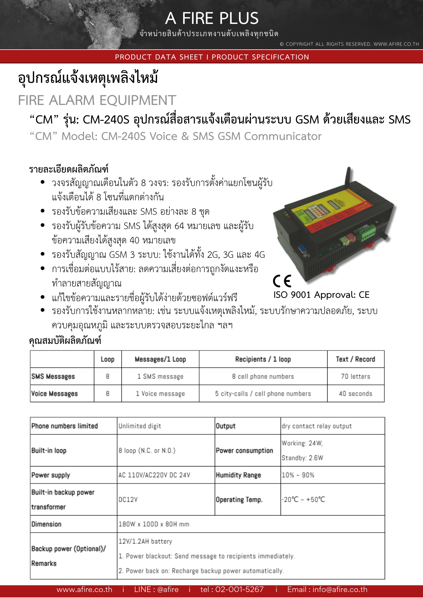 อุปกรณ์สื่อสาร แจ้งเตือนผ่านระบบ GSM ด้วยเสียงและ SMS วงจรสัญญาณเตือนในตัว 8 วงจร, มาตรฐาน CE