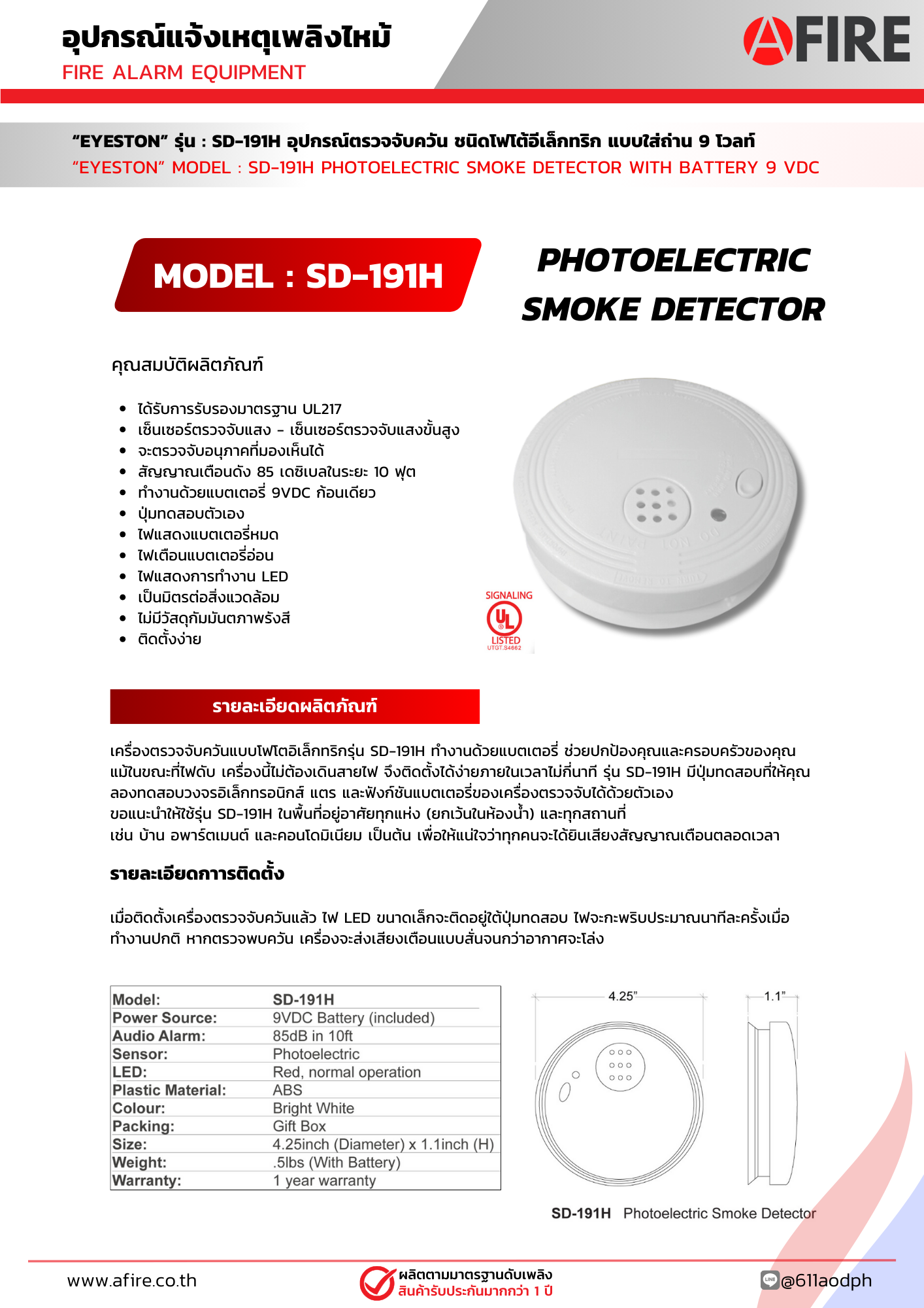 คุณสมบัติผลิตภัณฑ์ ได้รับการรับรองมาตรฐาน UL217 เซ็นเซอร์ตรวจจับแสง - เซ็นเซอร์ตรวจจับแสงขั้นสูง จะตรวจจับอนุภาคที่มองเห็นได้ สัญญาณเตือนดัง 85 เดซิเบลในระยะ 10 ฟุต ทำงานด้วยแบตเตอรี่ 9VDC ก้อนเดียว ปุ่มทดสอบตัวเอง ไฟแสดงแบตเตอรี่หมด ไฟเตือนแบตเตอรี่อ่อน ไฟแสดงการทำงาน LED เป็นมิตรต่อสิ่งแวดล้อม ไม่มีวัสดุกัมมันตภาพรังสี ติดตั้งง่าย