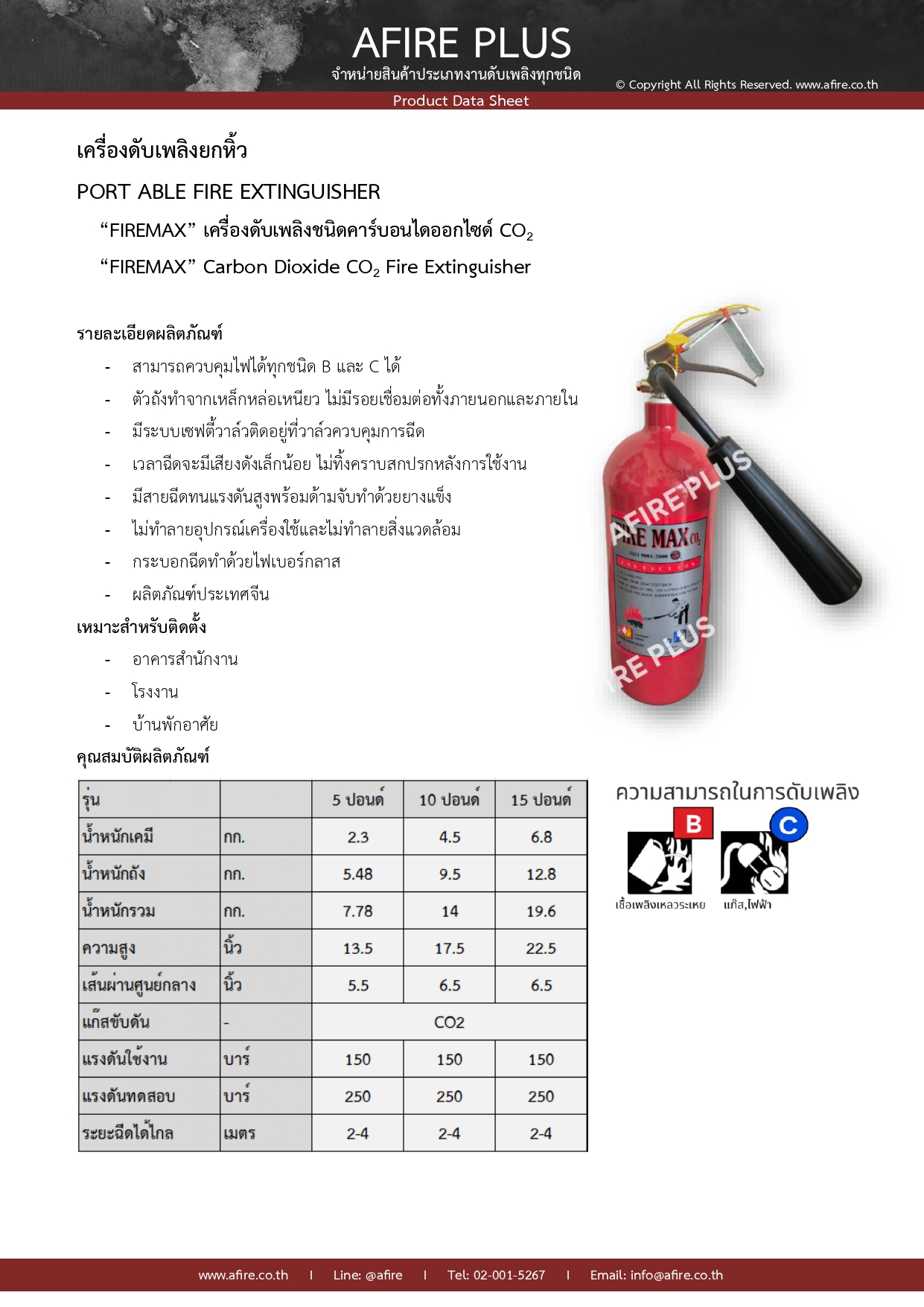 เครื่องดับเพลิงชนิดก๊าซคาร์บอนไดออกไซด์ (Co2) ขนาด 5 ปอนด์, 10 ปอนด์, 15 ปอนด์ ภายใต้เครื่องหมายการค้า “FIRE MAX” ตัวถังสีแดง บรรจุก๊าซคาร์บอนไดออกไซด์ไว้ในถังที่ทนต่อแรงดันสูง ที่ปลายสายฉีดจะมีลักษณะเป็นกระบอกหรือกรวย เวลาฉีดจะมีเสียงดังเล็กน้อย พร้อมกับก๊าซที่ออกมาจะมีลักษณะเป็นหมอกหิมะที่ไล่ความร้อนและออกซิเจน ฉีดโดยให้เข้าใกล้ฐานของไฟให้มากที่สุด ประมาณ 1.5-2เมตร เมื่อใช้งานแล้วพื้นที่จะสะอาดไม่ทิ้งคราบสกปรกให้หลงเหลืออยู่ ไม่ทำลายอุปกรณ์เครื่องใช้และไม่ทำลายสิ่งแวดล้อม CO2 ใช้ดับไฟประเภท B และ C ไฟที่เกิดจากไฟฟ้า แก๊ส น้ำมัน ระยะฉีดได้ไกล อย่างน้อย 3 เมตร