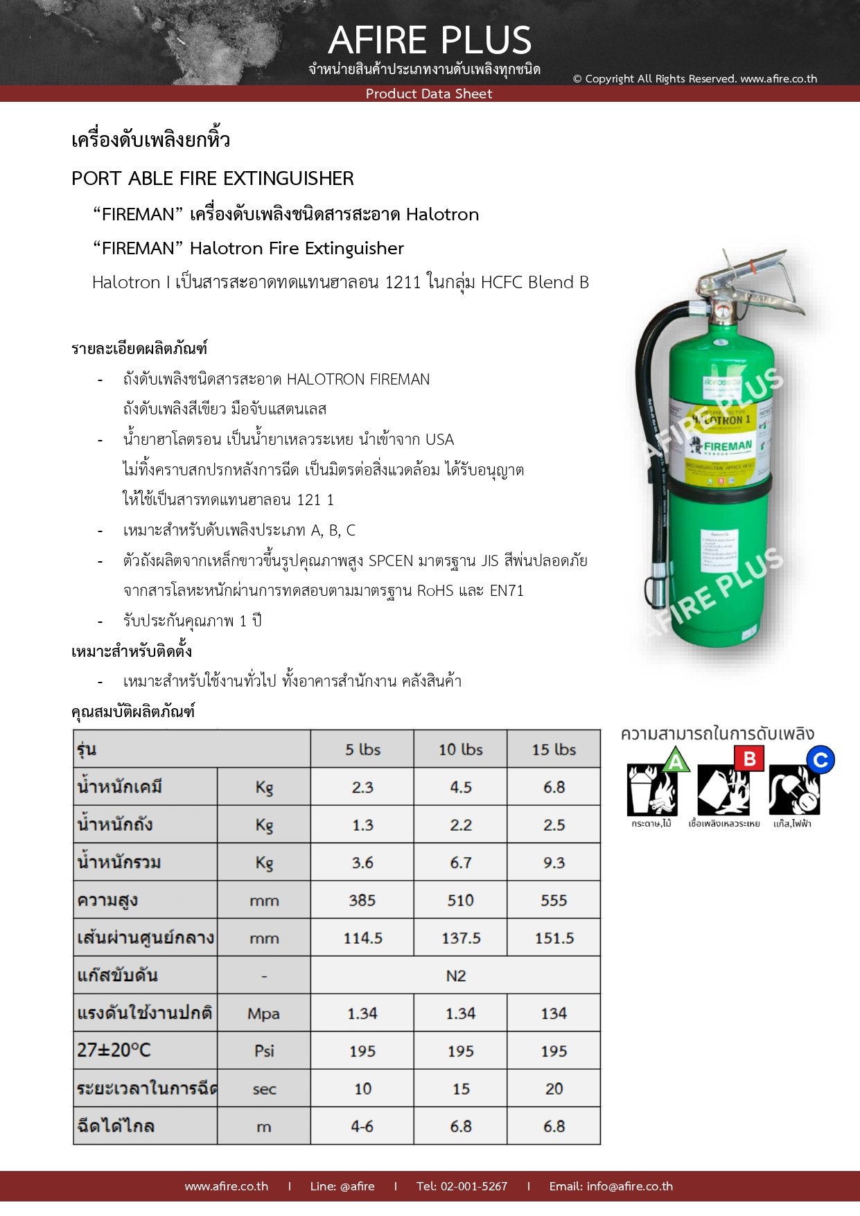 ถังตับเพลิงชนิดสารสะอาด HALOTRON FIREMAN (ไฟแมน) ถังดับเพลิงสีเขียว มือจับสเตนเลส น้ำยาฮโลตรอน เป็นน้ำยาเหลวระเหย นำเข้าจาก USA ไม่ทิ้งคราบสกปรกหลังการฉี่ด เป็นมิตรต่อสิ่งแวดล้อม ได้รับอนุญาตให้ใช้เป็นสารทดแทนฮาล่อน 121 1 เหมาะสำหรับดับเพลิงประเภท A, B, C งดับเพลิงมีขนาด 5 ปอนต์, 10 ปอนด์, 15 ปอนต์ รับประกันคุณภาพ 1 ปี