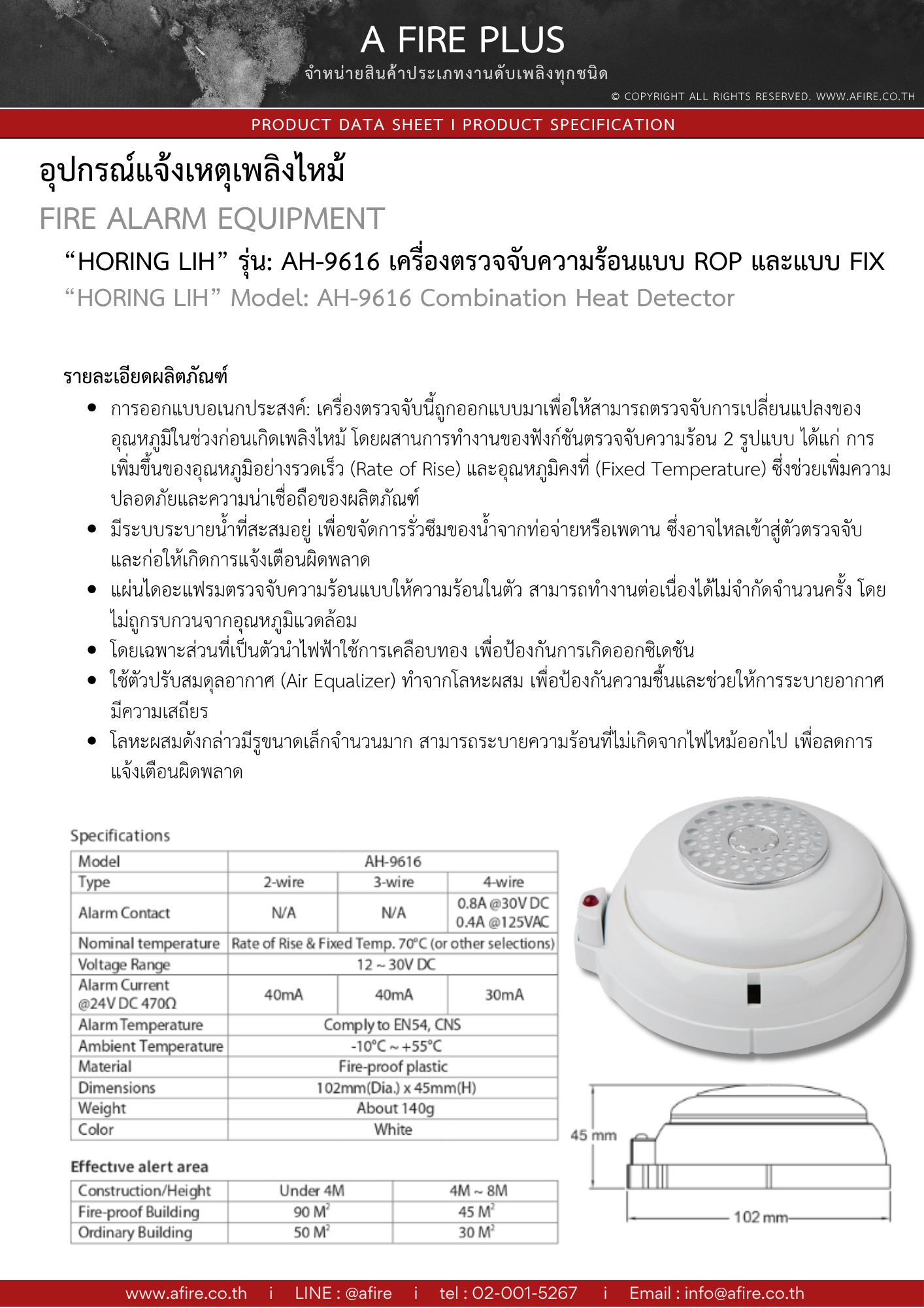 *MODEL : AH-9616 ใช้แทน CEMEN MODEL : S-319 อุปกรณ์ตรวจจับความร้อน 2 ระบบ 1.ระบบที่เปลี่ยนแปลงจากอุณหภูมิปกติ 9 องศาเซสเซียส หรือ 15 องศาฟาเรนไฮน์ ภายใน 1 นาที 2.ระบบตรวจจับอุณหภูมิคงที่ 70 องศาเซสเซียส วัสดุเป็นพลาสติกทนความร้อนสีขาว ใช้ไฟ 12 ~ 24 โวล์ท ตอนทำอลามจะมีไฟ LED สีแดงติดค้าง