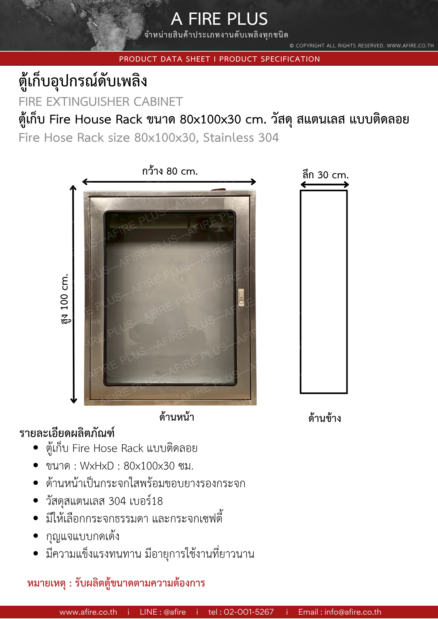 ตู้เก็บ FIRE HOSE RACK แบบติดลอย ขนาด 80x100x30 cm. วัสดุสแตนเลส 304 เบอร์18 ด้านหน้าเป็นกระจกใสพร้อมขอบยางรองกระจก กุญแจแบบกดเด้ง มีให้เลือกทั้งกระจกธรรมดา และกระจกเซฟตี้ มีความแข็งแรงทนทาน มีอายุการใช้งานที่ยาวนาน